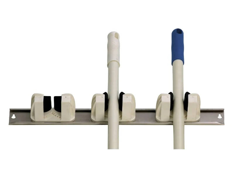 Système pratique qui permet de ranger les balais, raclettes, lave-ponts simplement en coinçant leur manche. Accepte les manches de 9 à 35 mm de diamètre.