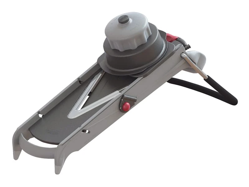 La Mandoline Viper De Buyer est constituée d’un chassis avec lame horizontale en V intégrée. Un poussoir protecteur en plastique équipé du contrôle de rotation pour guider les coupes cubes et losanges. Le poussoir est muni de son chariot accueillant fruits et légumes.
