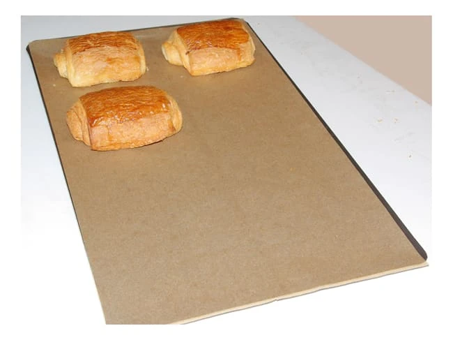 Papier kraft, siliconé 2 faces, anti-adhérent et utilisable jusqu’à 7 ou 8 fois selon les conditions de cuisson.