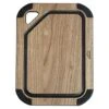 Planche épaisse à découper en bois de charme, composée de pavés de bois, façon billot de boucherie. Rigole et ramasse-jus usinés dans la masse.