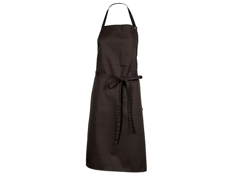 Tablier à bavette avec un tour de cou réglable par boutons pressions, il est très pratique avec sa poche poitrine pour stylo et une poche basse côté gauche. On l’ajuste avec une ceinture tissu.