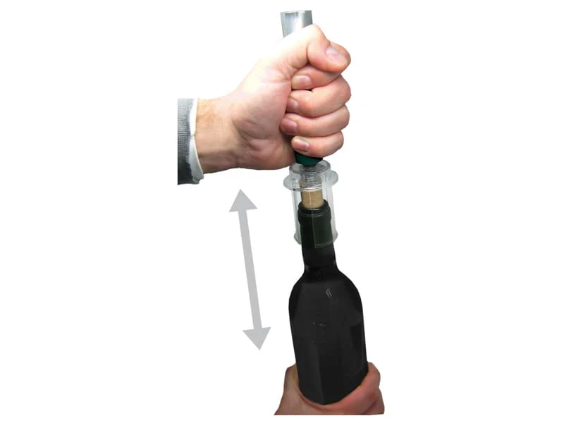 Transpercez le bouchon en liège avec l’aiguille métallique creuse, pompez 3 ou 4 fois seulement et le bouchon sort de la bouteille.