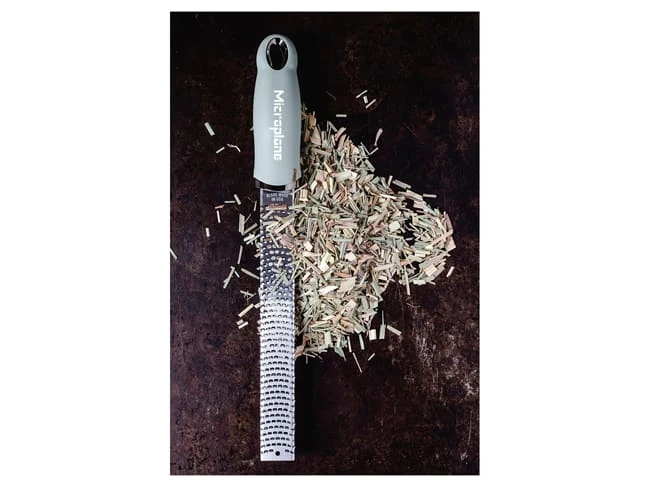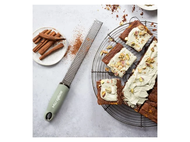 Le zesteur râpe Microplane assure vert sauge un résultat très fin et aéré.